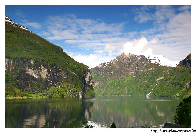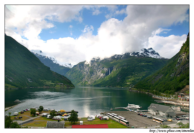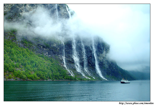蓋倫格峽灣(Geirangerfjord),號稱是挪威最美麗的峽灣,全長大約16公里,沿途處處都是奇岩飛瀑,令人目不暇給,美不勝收。峽灣裡最著名的景點就是「七姐妹瀑布 The Seven Sisters Waterfalls」,雲霧裊繞的峽灣與瀑布,更增添一份神秘的感覺,對面正好來了一艘遊覽船,雖然它的體積也不算小,但是在氣勢磅薄的自然景觀之中,也只能變成點綴的配角了。