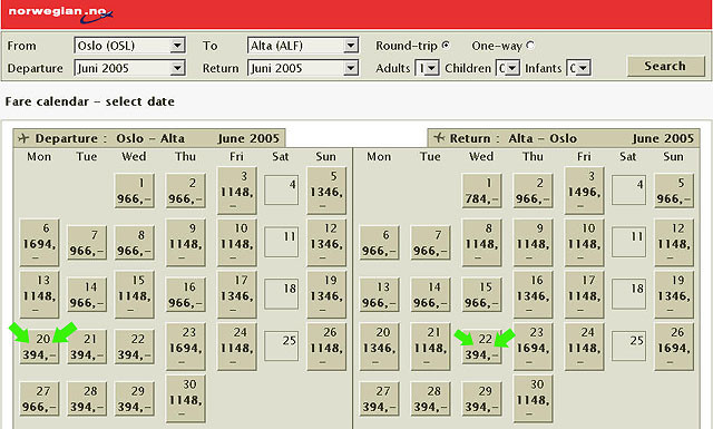 話說上次提到挪威航空票價飆漲的事,自從那次貪睡,讓Oslo飛Alta單程NOK394的好康擦身而過之後,我就三不五時盯著他網頁的報價,眼看著從NOK394漲到NOK1148,後來更又漲到NOK1346,一個人來回的差價已經達到新台幣9520元了,天啊~ ( NOK1346-NOK394 )x5(匯率)x2(來回)= NT9520。