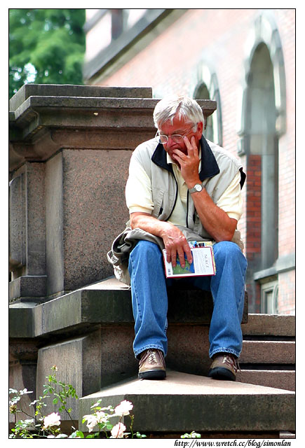 在正門口的階梯上,有位老先生正在閉目沉思(打盹?)
