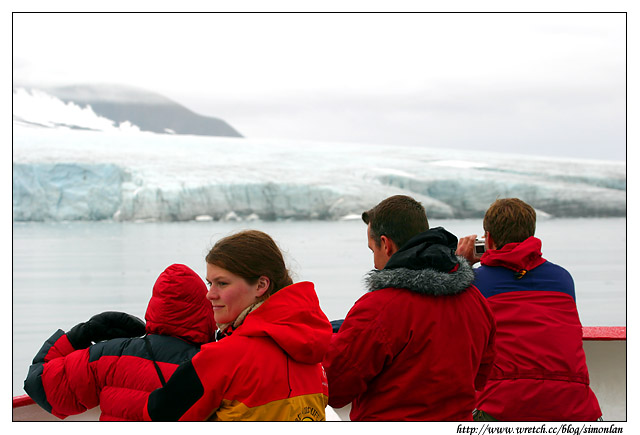2006年7月13日,北緯78度41分,氣溫0度,當天船上大約有十名旅客,幾乎一半是穿紅衣,我穿著綠色的雪衣,和一群紅衣人一起站在船頭,欣賞冰河美景,彼此之間只有讚嘆,沒有對立,更沒有恐懼。圖中那位擔任解說員的女生,是隨船的導遊。