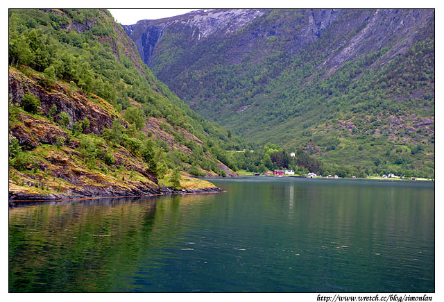 Flåm小鎮位於Flåm鐵路的起點和Aurland峽灣的盡頭處,Aurland峽灣其實是松恩峽灣的一個分支,從Flåm搭船出發,船首劃破了水面的群山倒影,進入Aurland峽灣,這段路程也是水面最寬廣的一段,最後到Nærøyfjord,水面寬度就越來越狹窄,最窄的地方僅僅不到300公尺寬。
