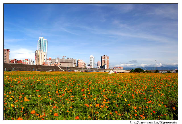 今天在當肯家看到他的新文章,想到我兩年前也去這裡拍過,把照片找出來一看,發現一件很奇怪的事,當肯拍的波斯菊,是傳統的紅白兩色,為什麼我當初去拍的卻是一片橘色呢?拍攝時間是2004年7月14日,遠方還有新人在拍婚紗照喔。